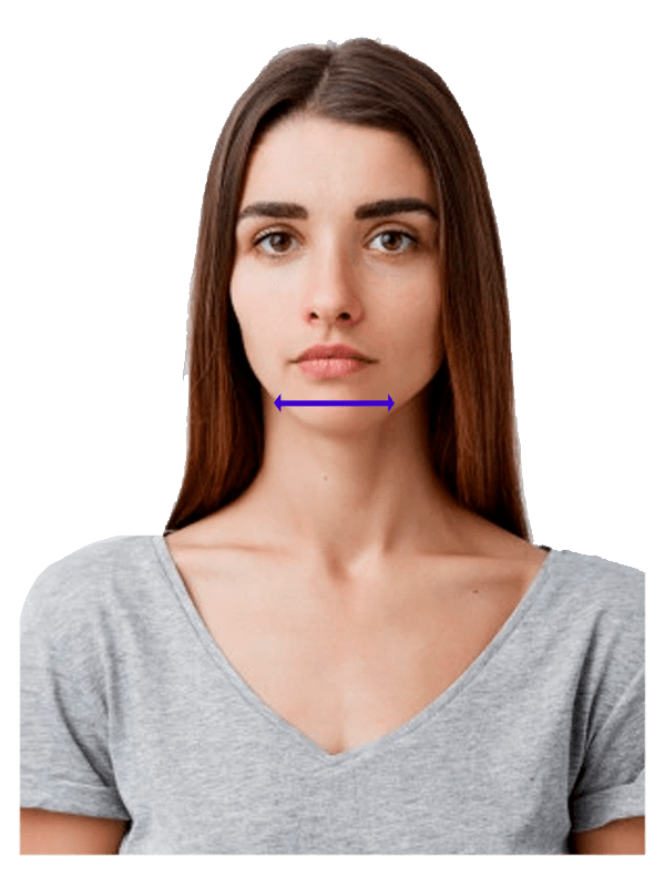 Toma una medida horizontal del ancho de la línea de la mandíbula, desde el inicio de la man- díbula debajo de la oreja hasta el otro Iado.